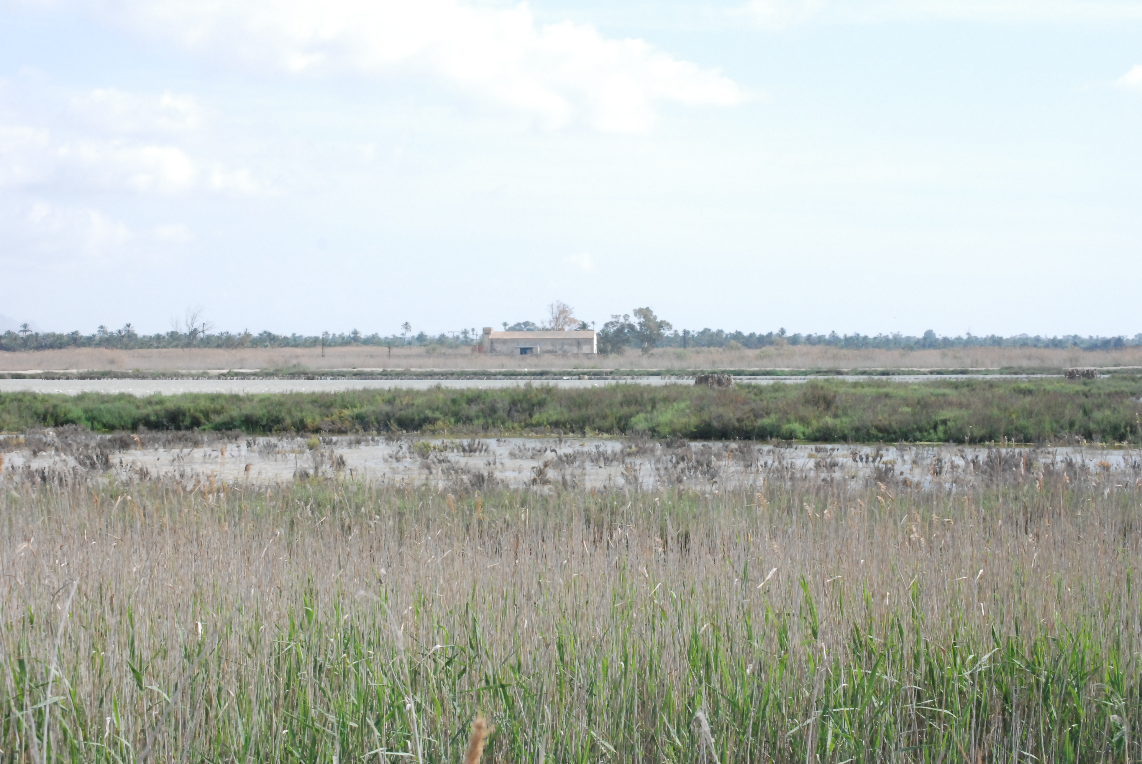 En cuanto a la flora, encontramos una franja de palmeral al fondo con algunos ejemplares diseminados en la finca en la que predominan los carrizos y juncales y también alguna salicornia. Se pueden ver Tamarix o Tamarit, especies protegidas como el Limmonium e incluso algunos ejemplares de hongos como la Xylaria Polymorpha.