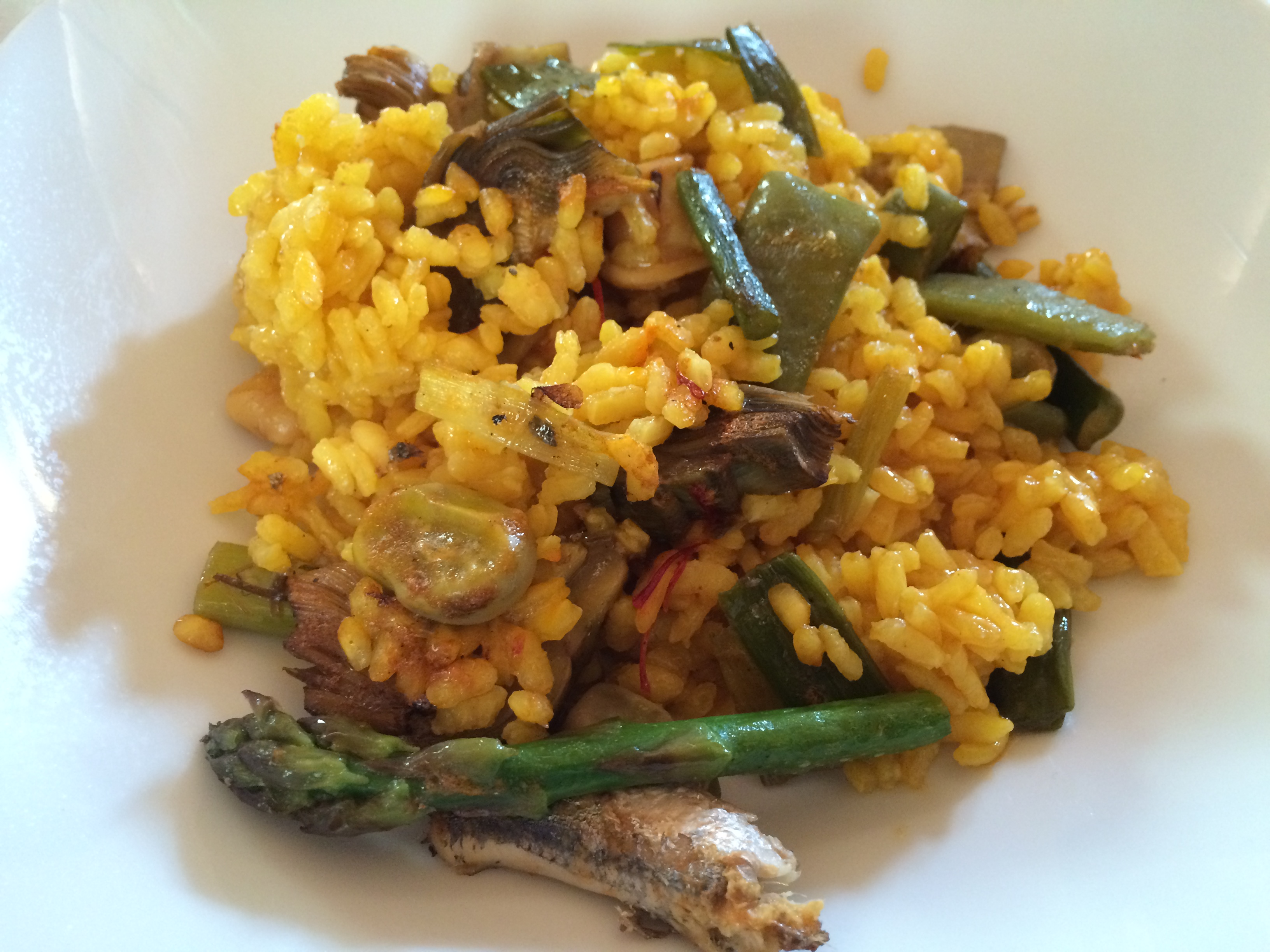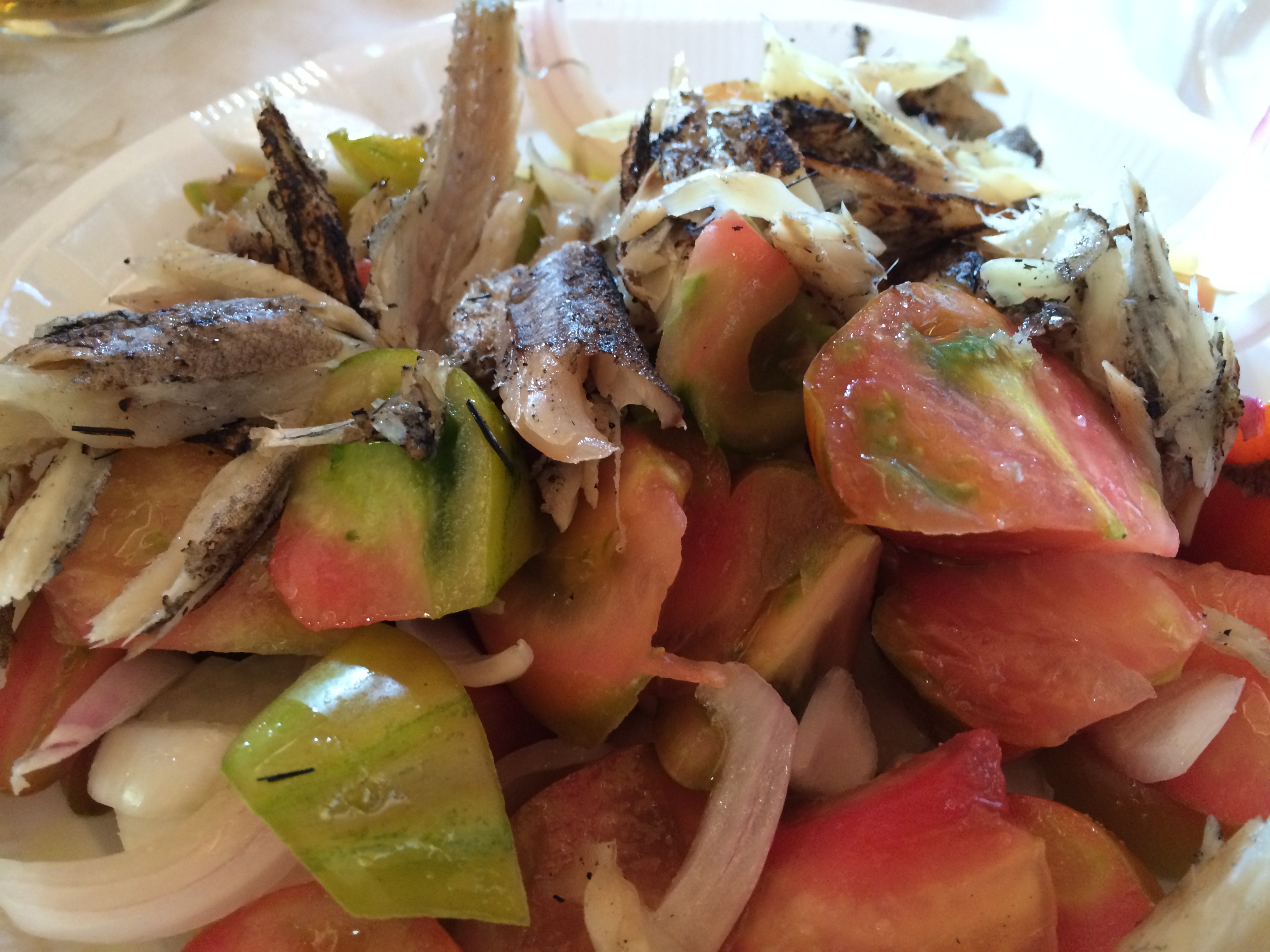 Para comer, productos y platos típicos de la zona: ensalada de capellanes asados con tomates y cebollas tiernas del Camp d’Elx, Arroz con verduras y boquerones con all i oli hecho con mortero con aceite de la Almazara El Tendre, Almonjábenas y todo regado con los vinos de la tierra.