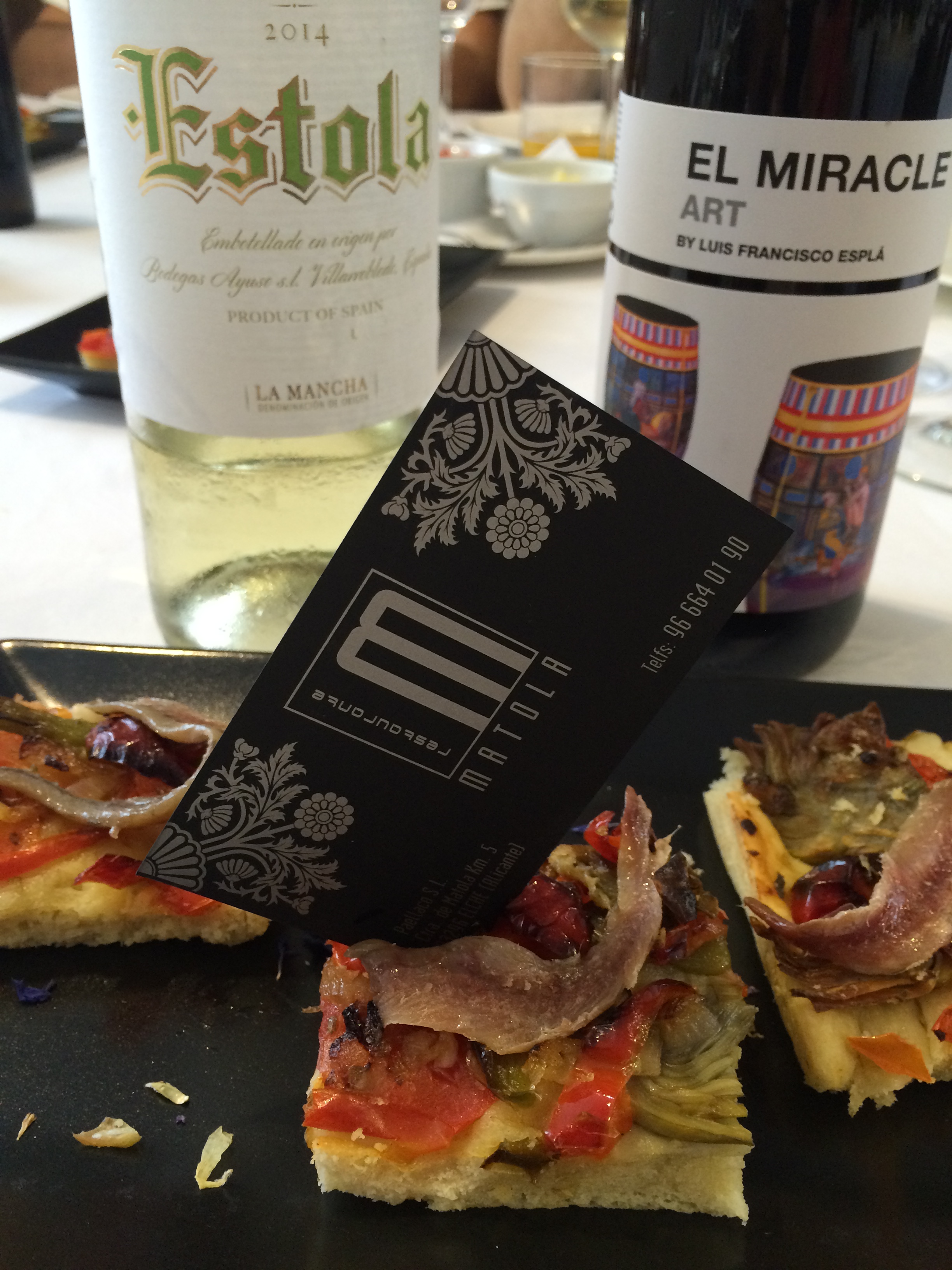 Nos han servido dos vinos, Estola, un blanco de las Bodegas Ayuso para los entrantes y un tinto de la D.O Vinos Alicante, El Miracle Art para acompañar el plato principal.