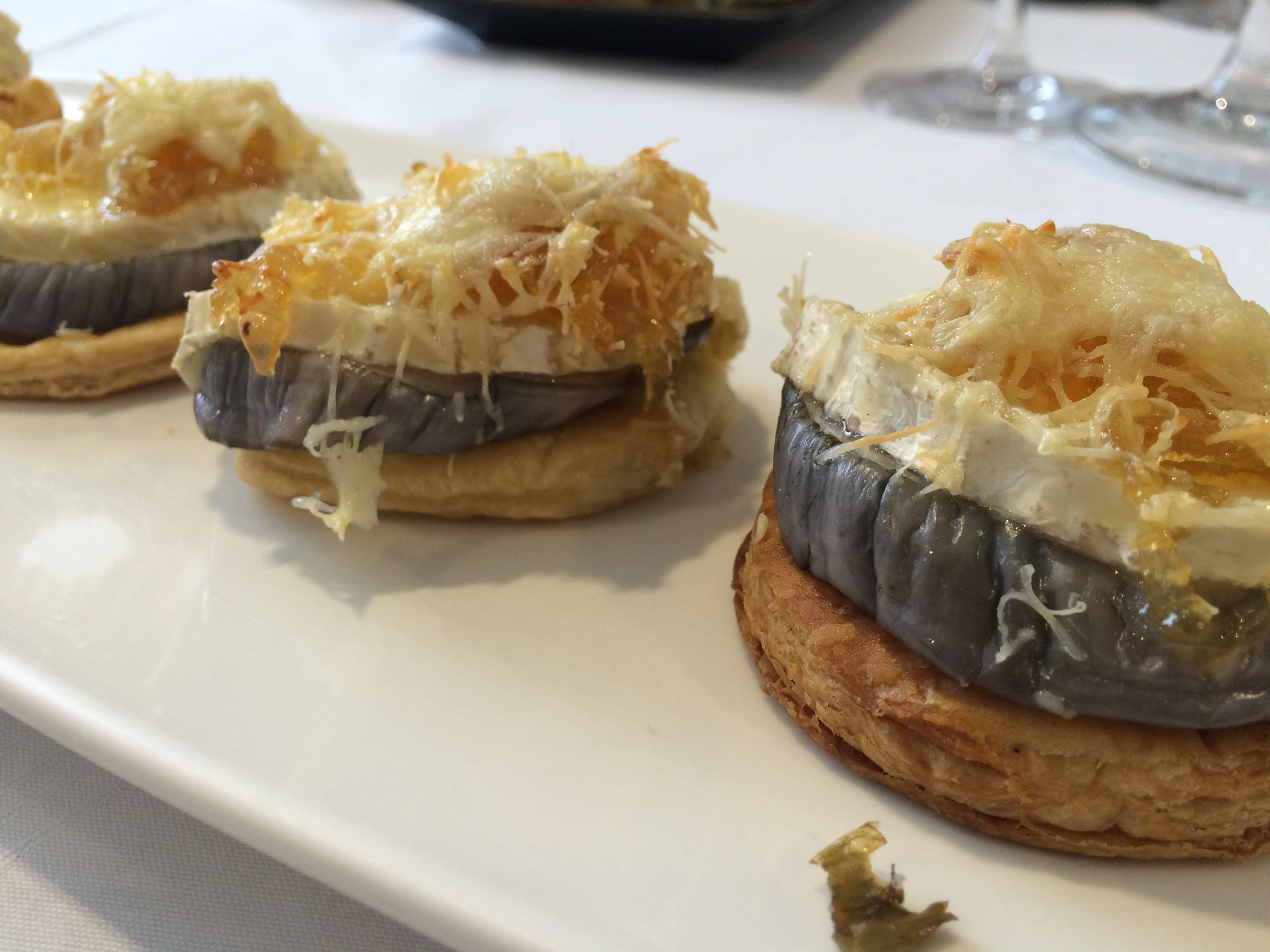 Para romper el hielo, «Coca del Camp». Base de masa de pan con una escalivada muy suave: pimiento, tomate, berenjena, alcachofas y tomates asados con un remate de anchoas.