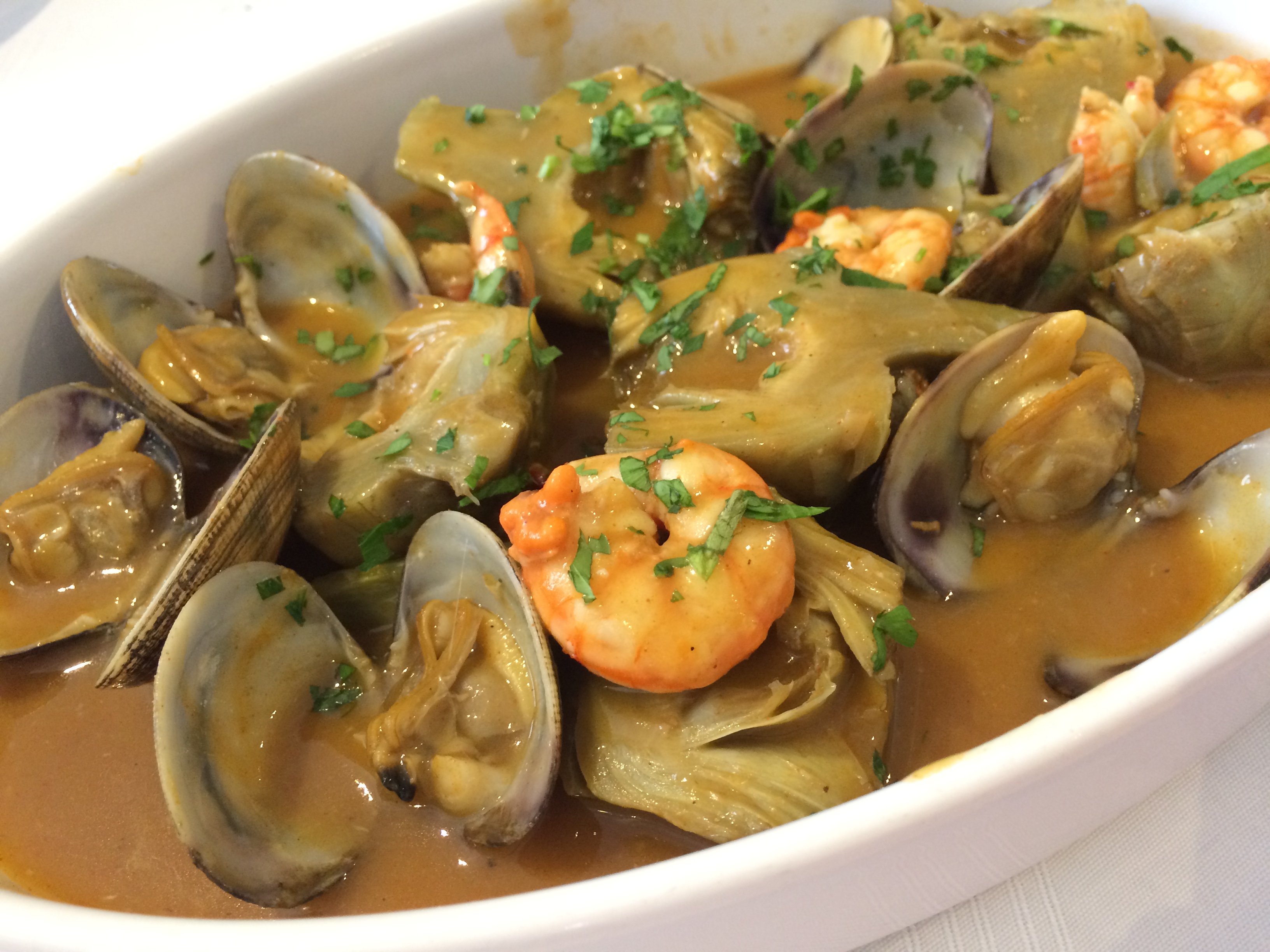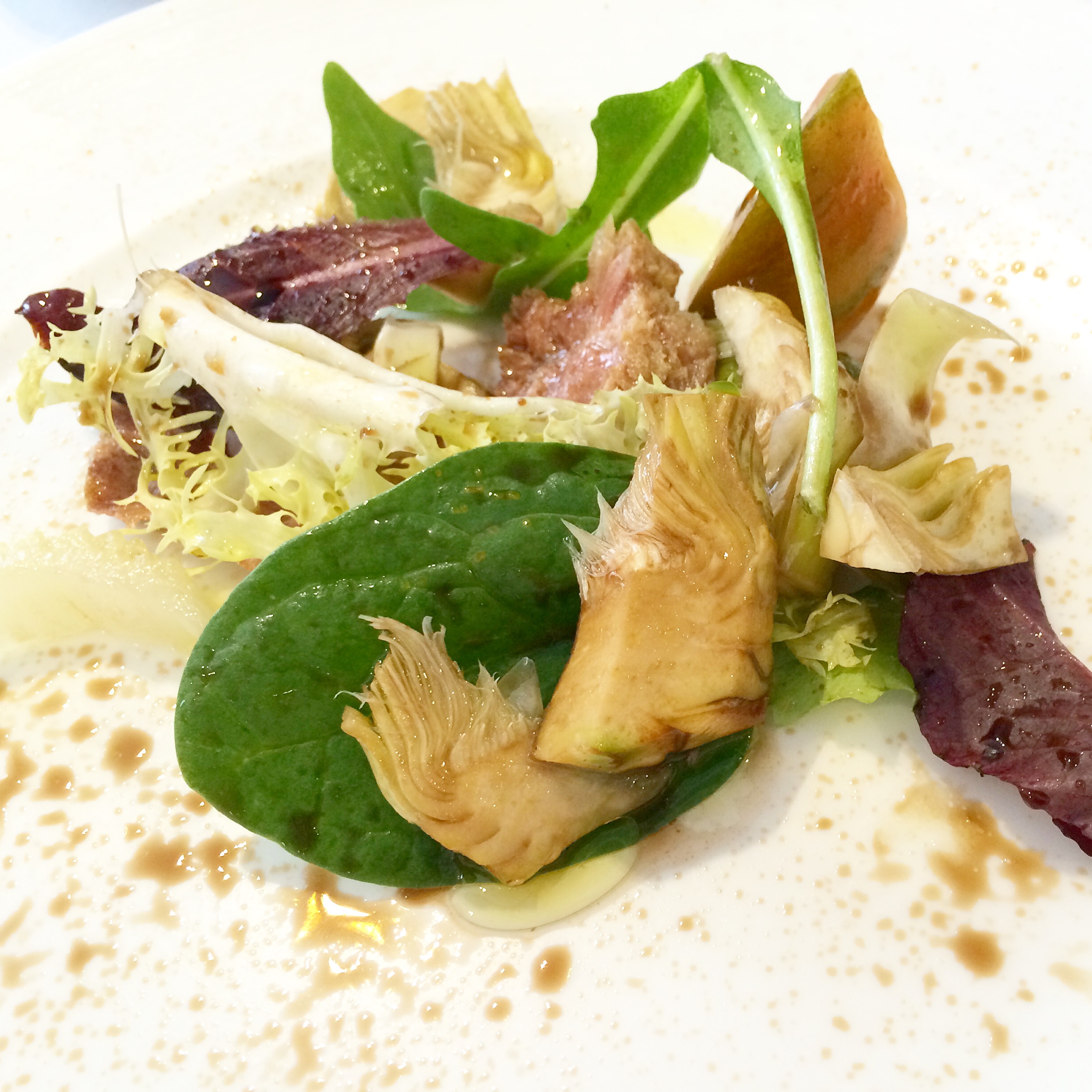 El arroz ha venido precedido de unas Berenjenas sobre hojadre y rulo de cabra, las Alcachofas con gambas y almejas, y una Ensalada Verde.