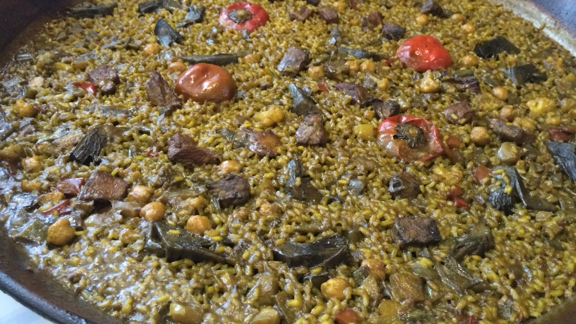 Como plato principal hemos pedido dos paellas, era difícil decidirse por uno de los tres arroces del menú y así hemos probado el Arroz con conejo y serranas y el Arroz de verdura y presa ibérica