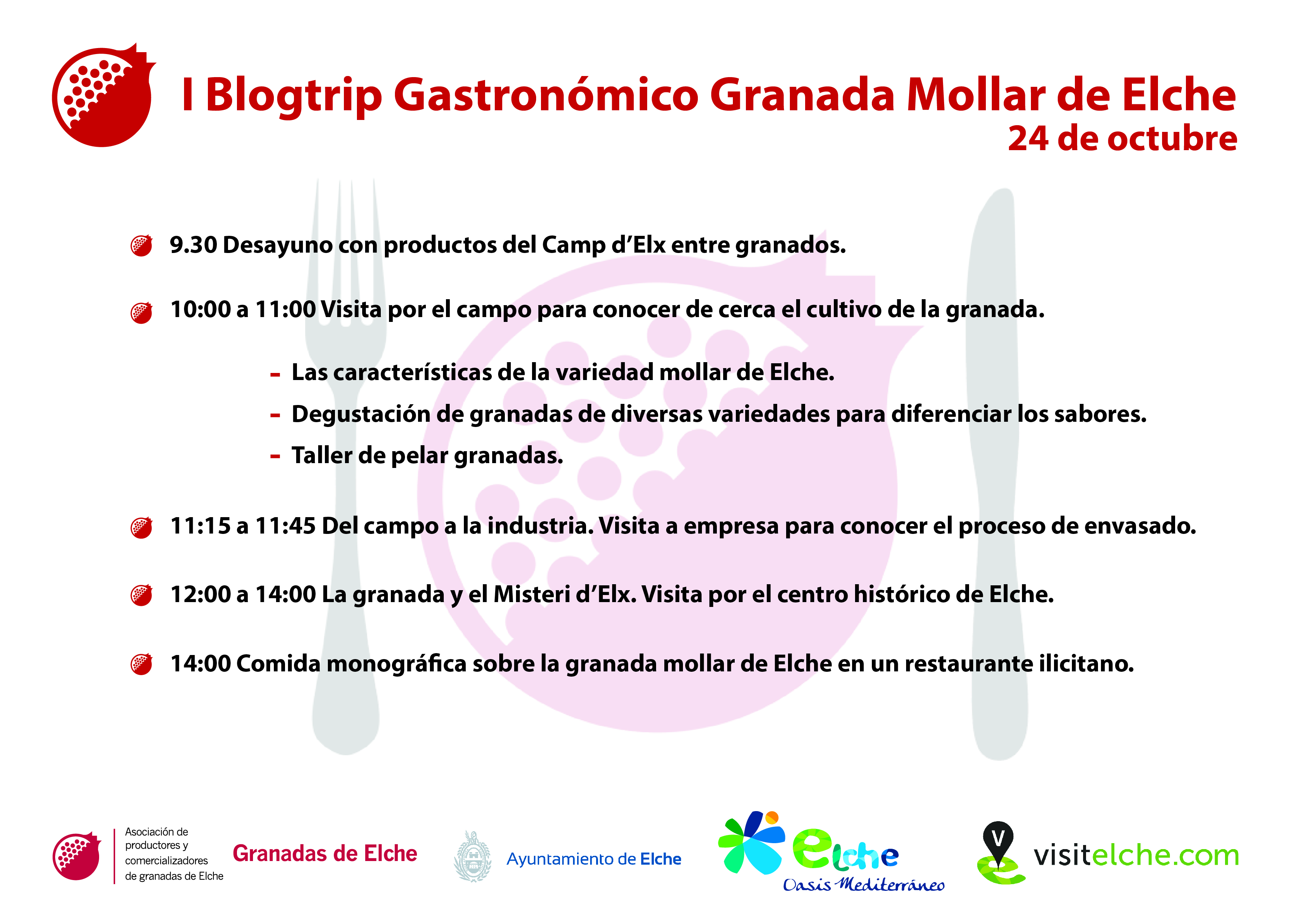 Visitaremos el Camp d’Elx donde se llevará a cabo una degustación de diversas granadas, un taller de pelarlas y también obtendremos información relacionada con el cultivo. Además, habrá un desayuno a base de productos del Camp d’Elx y mermelada y zumo de granada mollar de Elche.