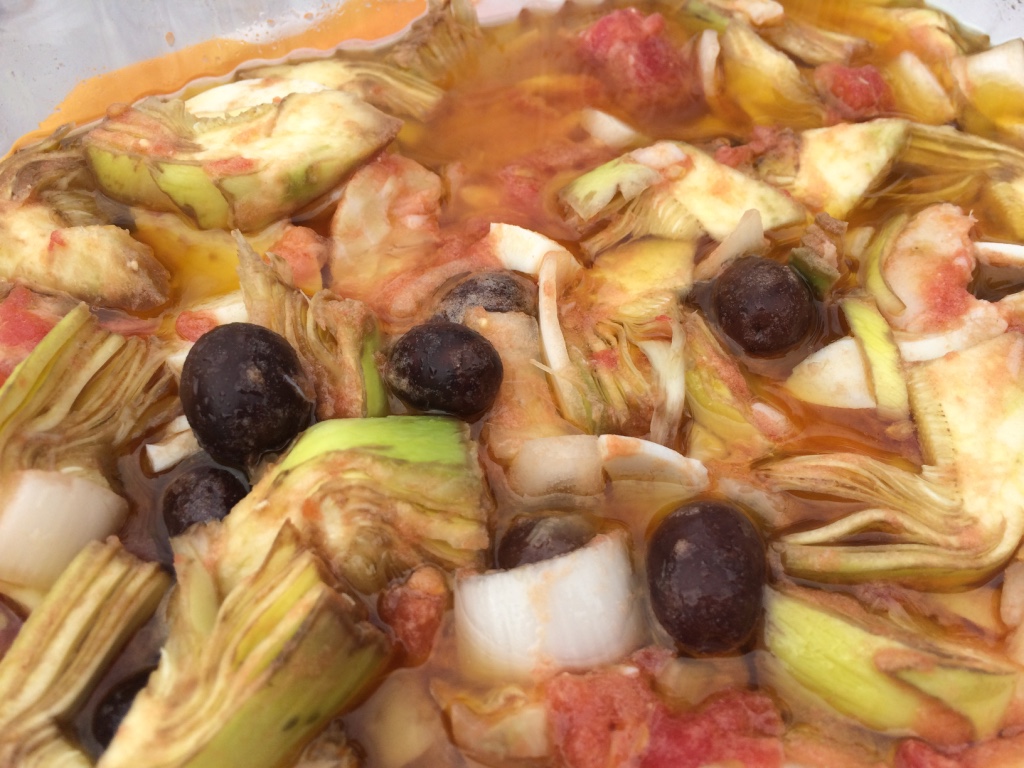 Ingredientes: cordero (pierna o codillo) cebolla y alcachofas.