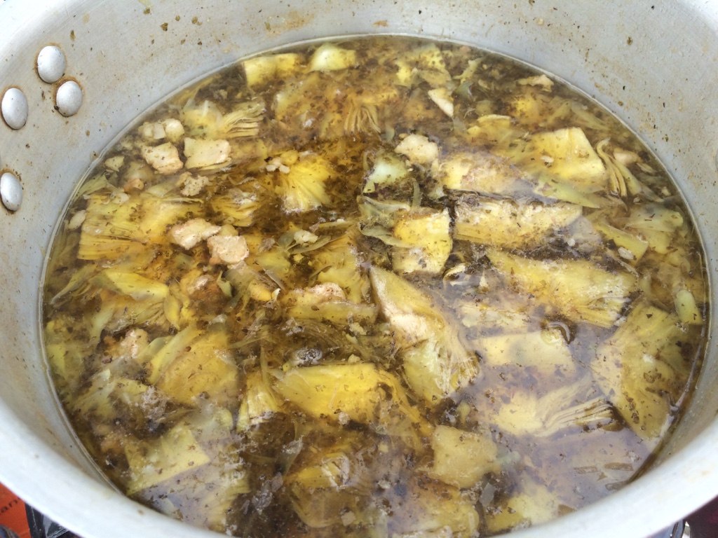 Rellenar las alcachofas de atún, huevo duro y tomate triturado en conserva. Poner a hervir con perejil, dos o tres dientes de ajo, un vaso de vino el resto hasta cubrir, de agua, y una chorradita de aceite de oliva virgen.